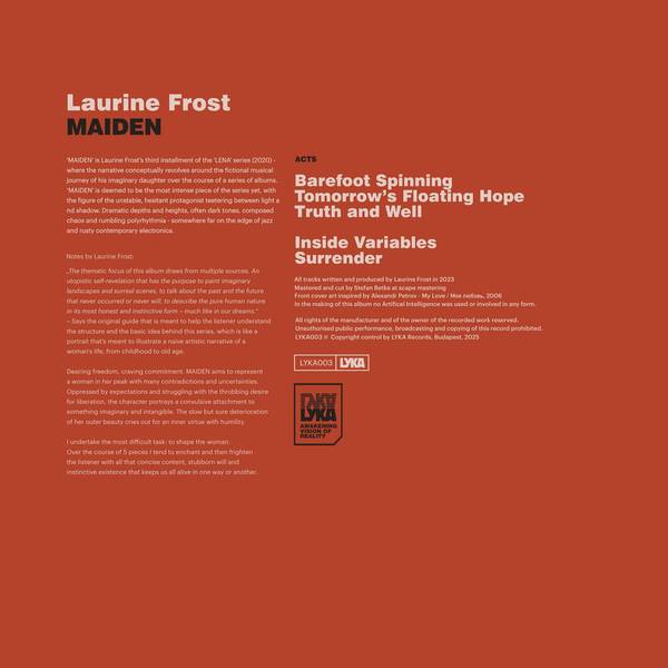 MAIDEN is Laurine Frost's third instalment of the 'LENA' series - where the narrative conceptually revolves around the fictional musical journey of his imaginary daughter over the course of a series of albums. ‘MAIDEN' is deemed to be the most intense piece of the series yet, with the figure of the unstable, hesitant protagonist teetering between light and shadow. Dramatic depths and heights, often dark tones, composed chaos and rumbling polyrhythmia - somewhere far on the edge of jazz and rusty contemporary electronica.